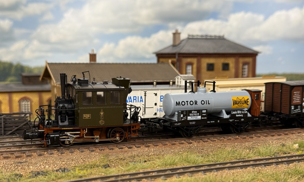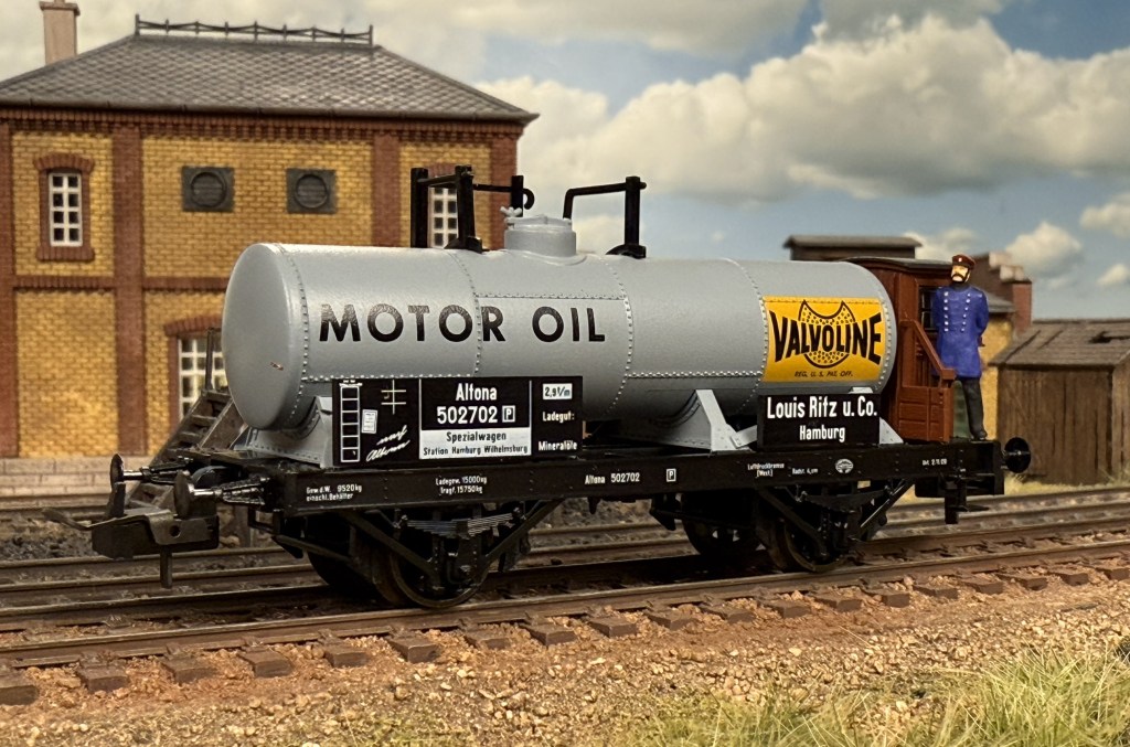 The final car in the set is the Altona 502702, a tank car from Louis Ritz u. Co in Hamburg. The signs advertises Valvoline motor oil, and reading on the web, it seems clear that the company existed and seemed to import oil from the US, where oil under the name Valvoline were sold at least since 1873.