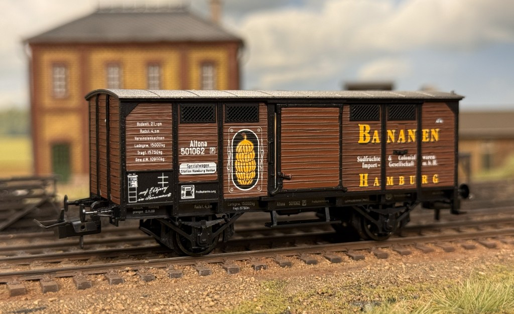The most striking car in my opinion is the boxcar Altona 501062 marked “Bananen Hamburg”, a logo and the name of the company, SĂĽdfrĂĽchte & Colonialwaren Import-Gesellschaft m.b.H. The boxcar has a revision date of 1909, and in this period bananas and other exotic fruit was becoming immensely popular in Northern Europe.